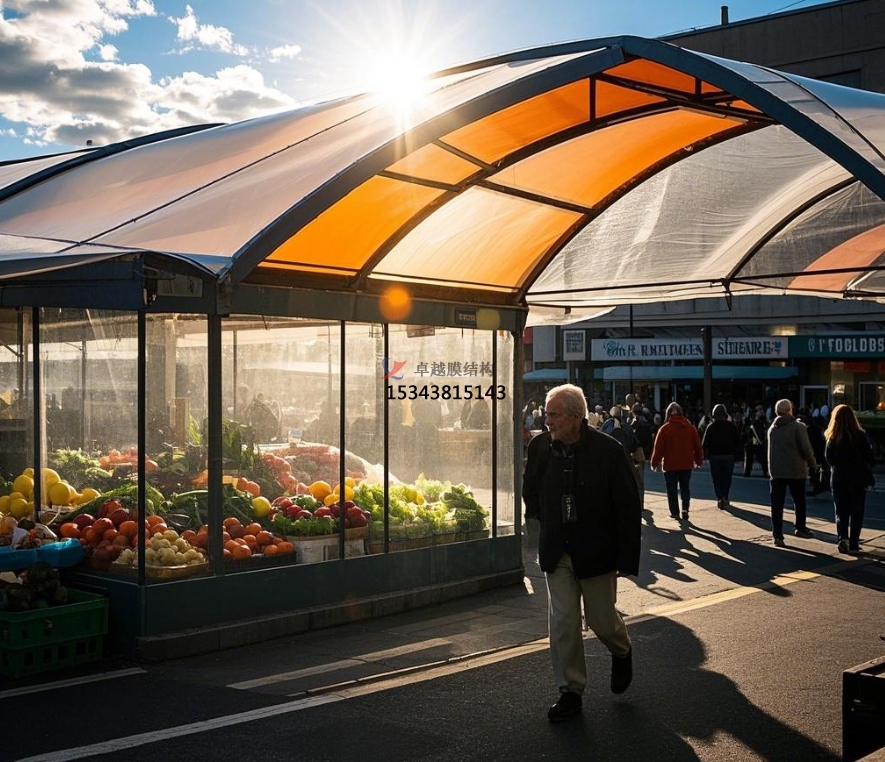 在采光與通風上,膜結構頂棚相同體現(xiàn)出色。多數(shù)膜材具有杰出的透光性,可讓天然光線柔軟地灑入商場內部。這種天然采光不只節(jié)約了電力照明本錢,營建出明亮舒適的購物環(huán)境,還能讓顧客更明晰地挑選新鮮食材。一起,膜結構頂棚的開放性與靈敏的空間布局,有利于空氣天然流通,有用驅散商場內的異味與熾熱,保持空氣新鮮,減少細菌滋生,為顧客與商戶發(fā)明健康的環(huán)境。
