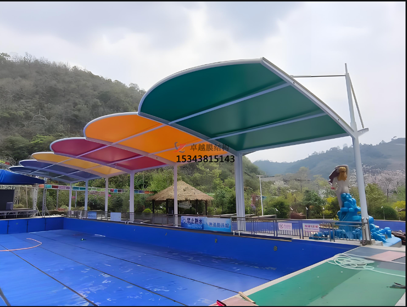 案例 :膜結(jié)構(gòu)遮陽棚采用PVC/PVDF材質(zhì),顏色豐富(如橙色、藍色),與綠植形成對比,提升公園藝術(shù)性。