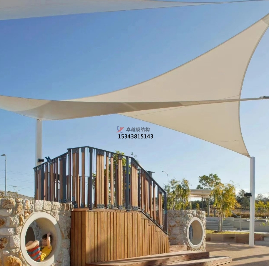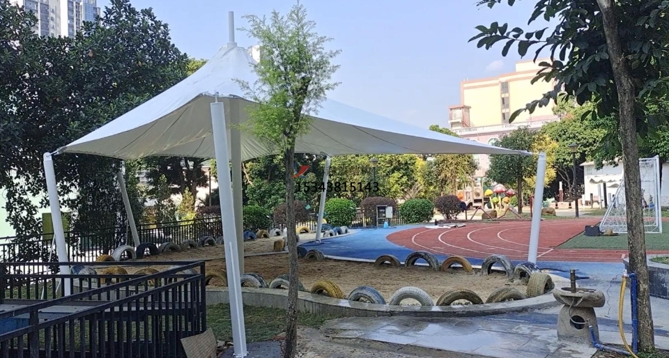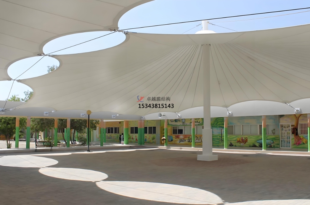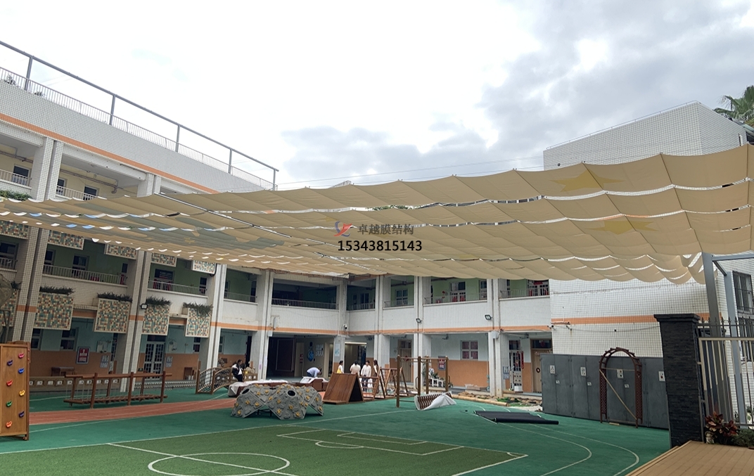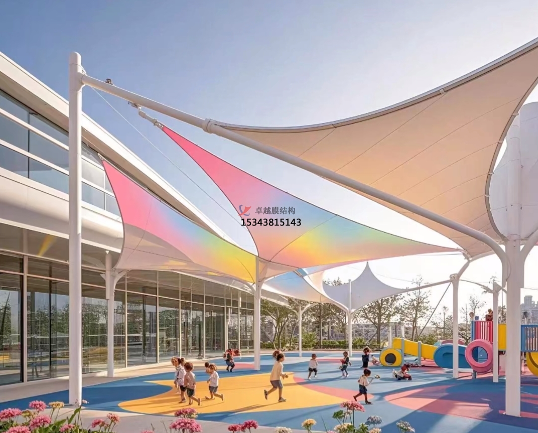 膜材料具有良好的透光性,可以在保證遮陽的同時,讓自然光線柔和地灑入室內(nèi),為孩子們提供充足的日照,有利于他們的視力保護(hù)和身心健康。同時,膜結(jié)構(gòu)的設(shè)計(jì)通常結(jié)合高效的通風(fēng)系統(tǒng),確保室內(nèi)空氣流通,即使在炎熱的夏季也能保持室內(nèi)涼爽,為孩子們創(chuàng)造一個舒適的學(xué)習(xí)環(huán)境。