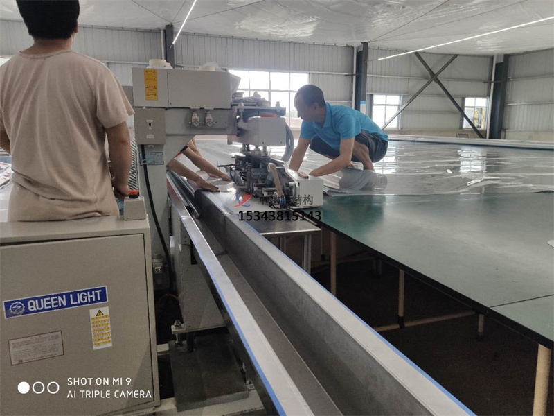 無塵焊接中,膜材在平臺固定,軌道機滑動焊接。