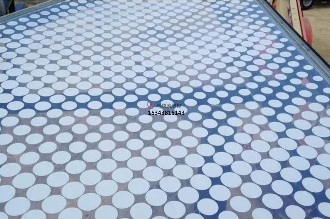 ETFE薄膜不僅具有優(yōu)良的抗沖擊性能,熱穩(wěn)定性能及耐候性,自清潔性,耐化學腐蝕性能,且重量只有同等面積玻璃的1%。 印刷ETFE膜材最常用的圖案是圓形銀點,由于銀對太陽輻射的反射,印刷面積的百分比根據(jù)太陽熱增益因子的要求進行評估。