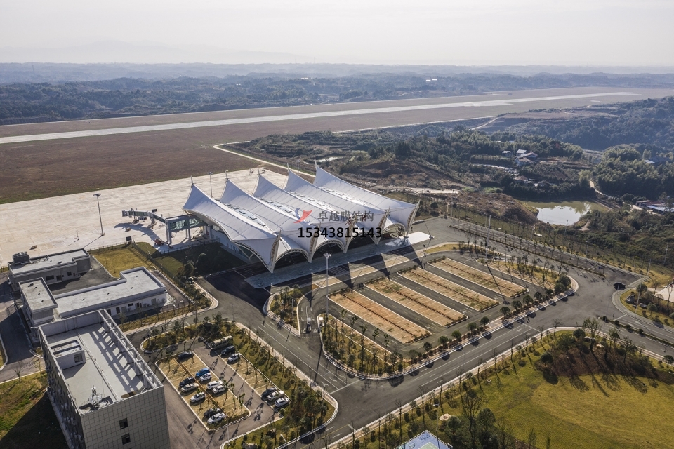 航站樓創(chuàng)新性地采用PTFE拉膜結(jié)構(gòu)體系創(chuàng)造出具有獨(dú)一無二的現(xiàn)代航空港造型,鋼結(jié)構(gòu)梭柱與白色拉膜的組合將岳陽的傳統(tǒng)景點(diǎn)——瀟湘八景之一:“遠(yuǎn)浦歸帆”的意境以現(xiàn)代的方式重新演繹,體現(xiàn)濃郁的現(xiàn)代氣息的同時(shí)又延續(xù)了傳統(tǒng)地域文化。