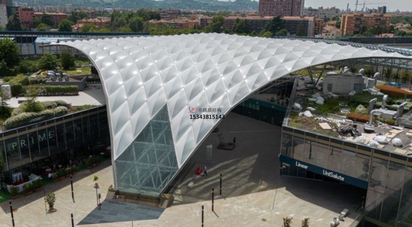 商業(yè)購物中心的主要特點(diǎn)是因商業(yè)店鋪的集中而形成了室內(nèi)室外購物、休閑、餐飲等功能空間,步行街及中央活動(dòng)區(qū)域是人們行走、休息、交流的開放空間,基于商業(yè)街特色,就決定了所有設(shè)計(jì)的核心就是讓空間更具人性化。屋頂作為建筑附加設(shè)施,不僅要求遮陽避雨的實(shí)用功能,也應(yīng)該是錦上添花的設(shè)施。目前國(guó)內(nèi)外膜結(jié)構(gòu)應(yīng)用于商業(yè)綜合體的工程案例越來越多,膜結(jié)構(gòu)建造的屋頂擁有很多傳統(tǒng)屋頂所不具備的優(yōu)勢(shì)特點(diǎn)。