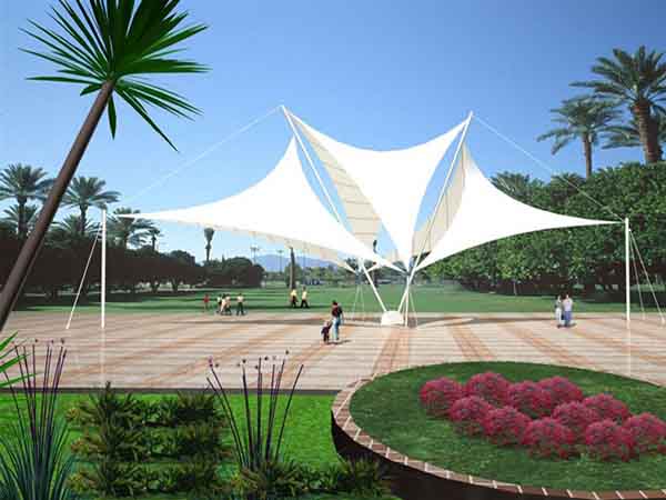 2、景觀膜結(jié)構(gòu)是目前發(fā)展很快的一種新型空間結(jié)構(gòu),是一種效率極高的張力集成體系,可以充分發(fā)揮鋼索的強(qiáng)度與張拉整體結(jié)構(gòu)的空間作用。它通過(guò)鋼骨架、鋼索與膜材共同受力形式穩(wěn)定曲面來(lái)覆蓋建筑空間,具有高度的形體可塑性和結(jié)構(gòu)靈活性,即通過(guò)對(duì)膜材內(nèi)部施加一定的預(yù)張力,使其具備了抵抗外荷載能力,從而充當(dāng)結(jié)構(gòu)材料的一種結(jié)構(gòu)體系。我公司先后在金華地區(qū)承接了金華永盛廣場(chǎng)景觀、金華中心廣場(chǎng)景觀、金華建筑藝術(shù)公園景觀小品的設(shè)計(jì)施工,簡(jiǎn)介如下: