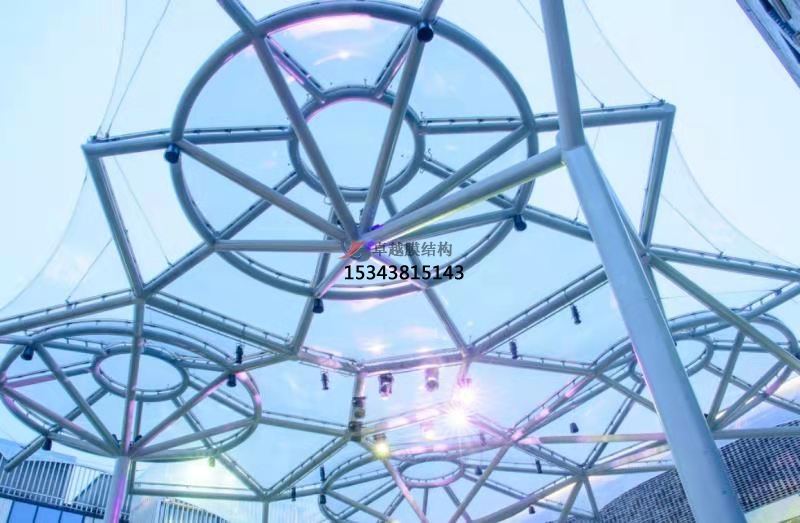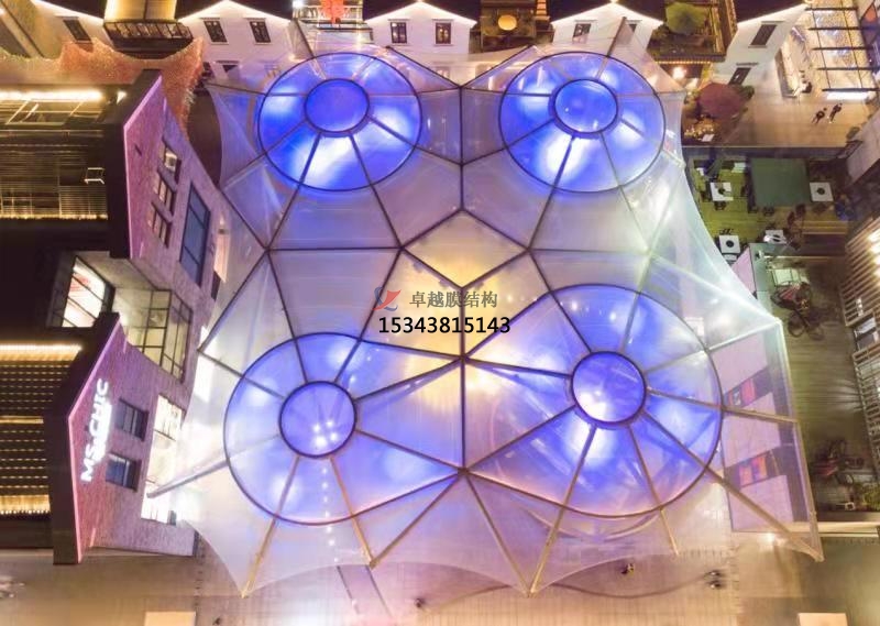膜結(jié)構(gòu)的曲面造型與半透明特性,可模擬四季光影變幻,如某項目通過投影技術(shù)在天幕呈現(xiàn)沉浸式星空、森林等主題場景,成為網(wǎng)紅打卡地‌。