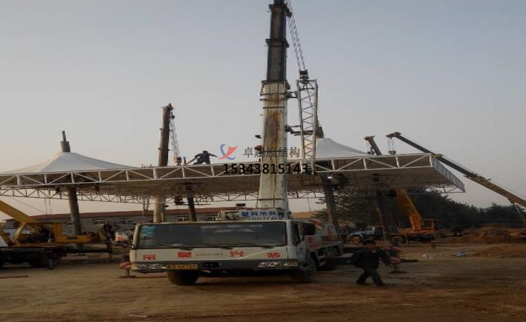 三:自潔性-自始至終保持潔白美麗:膜材料具有極高的非粘著性,加油站膜結構看臺,在我們日常使用不沾鍋時就可以體會到這一特性。膜材料的表面不僅不易附著臟物及灰塵,而且其表面的灰塵會被雨水自然地沖洗干凈,所以經過長年使用仍然保持外觀的潔凈及室內的美觀。