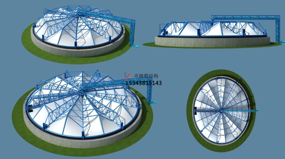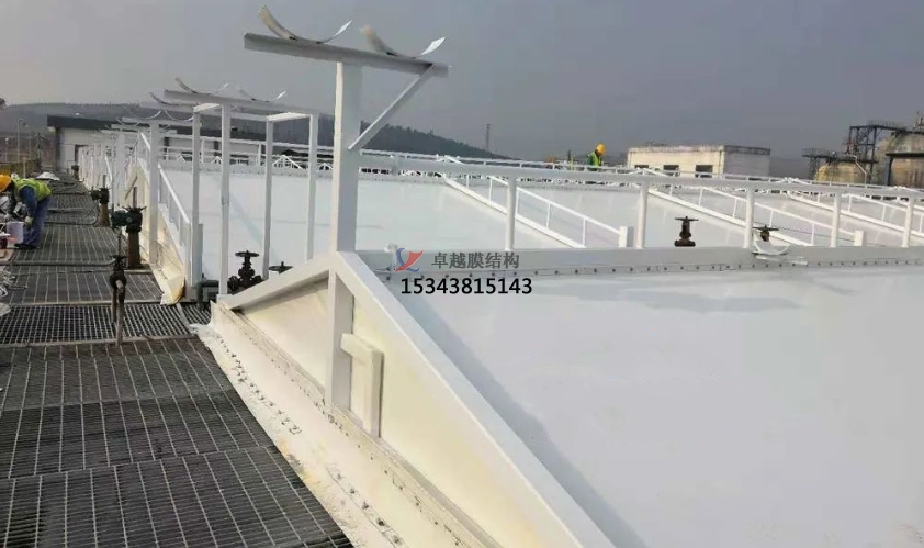 污水處理池加蓋,也稱反吊膜封閉,與常規(guī)建筑膜結構不同之處在于,鋼構在外部做支撐結構,膜材安裝在內(nèi)部做防護密閉,此類膜材采用污水池專用材料,具有防腐蝕、抗老化、免維護、美觀耐久、經(jīng)濟適用等優(yōu)點。