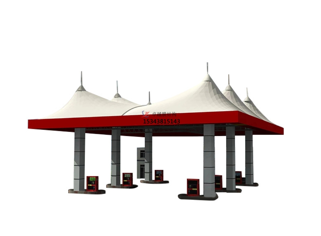 3. 靈活的造型設(shè)計:加油站膜結(jié)構(gòu)頂棚可根據(jù)建筑需求進(jìn)行個性化設(shè)計,采用曲面造型,不僅美觀大方,還能有效分散雨水和風(fēng)力,增強(qiáng)頂棚的穩(wěn)定性。