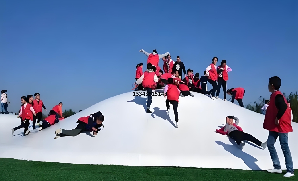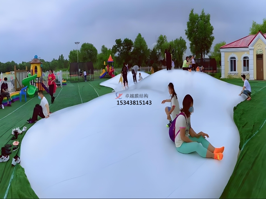 蹦蹦云的設(shè)計(jì)高度靈活,可根據(jù)場(chǎng)地環(huán)境定制形態(tài)與規(guī)模。無論是平坦空地還是起伏地形,均可通過設(shè)置沙坑、坡度或洞穴,塑造自然野趣的游樂場(chǎng)景。其純白外觀與云朵造型,既能融入景區(qū)生態(tài)景觀,也可作為商業(yè)地產(chǎn)的網(wǎng)紅打卡點(diǎn)。從親子樂園到度假村,從生態(tài)農(nóng)莊到特色小鎮(zhèn),蹦蹦云以 “可蹦、可滑、可躺” 的多維體驗(yàn),滿足全年齡段游客的互動(dòng)需求。