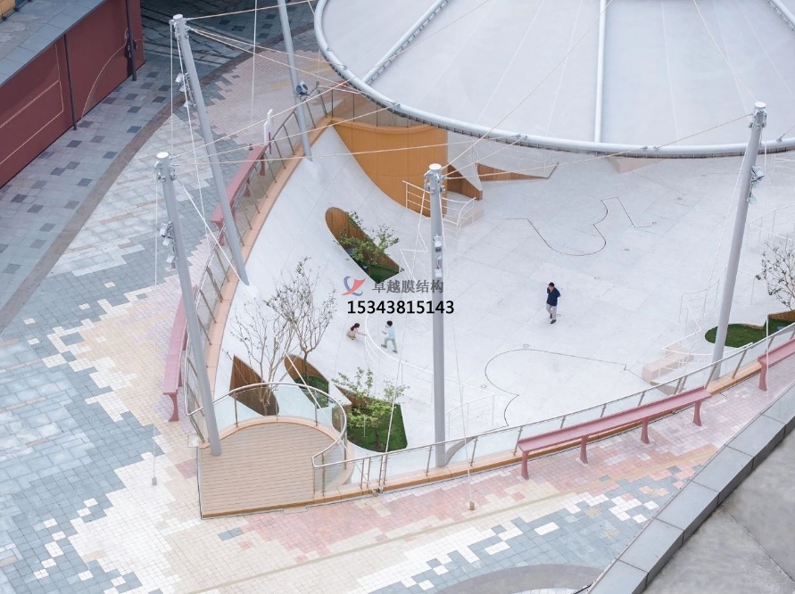 “浮庭”由上方如同水母般漂浮的半透明織物膜結(jié)構(gòu)與下方懸浮感的地景花園共同組成。膜結(jié)構(gòu)既成為了廣場的頂蓋,形成包覆與洞天的感受,也作為織連體引導(dǎo)主要流線銜接了室外幾個重要節(jié)點(diǎn)。結(jié)合原混凝土柱的加寬基礎(chǔ)上支起鋼柱,以懸吊與支承合作的形式將膜結(jié)構(gòu)撐起,減少了廣場中結(jié)構(gòu)的出現(xiàn)。