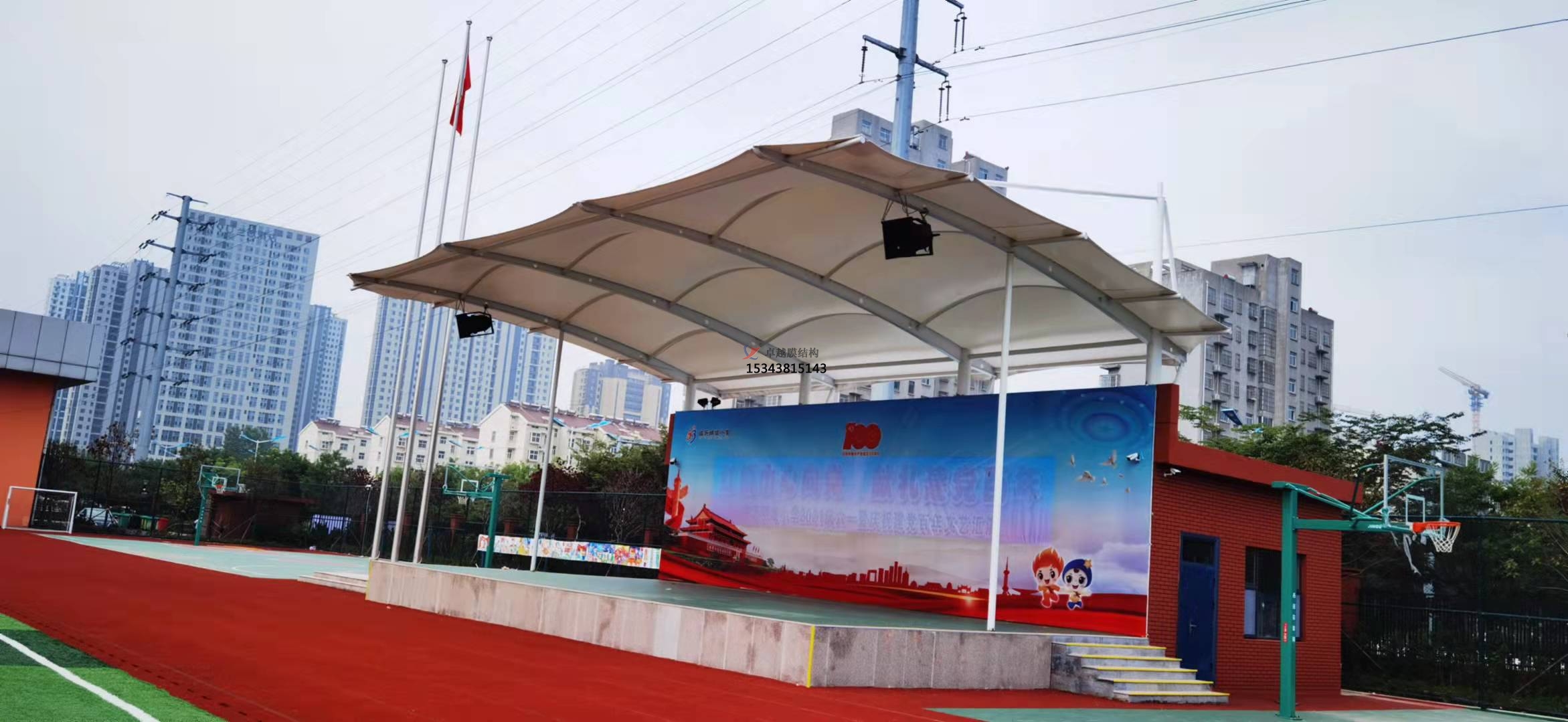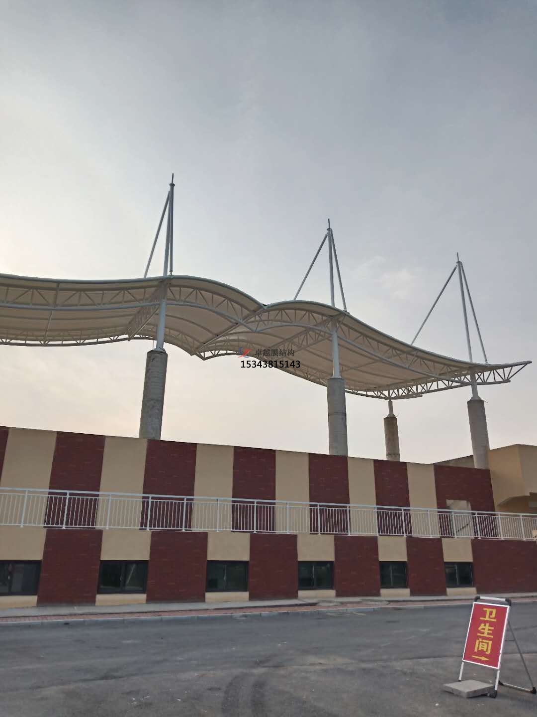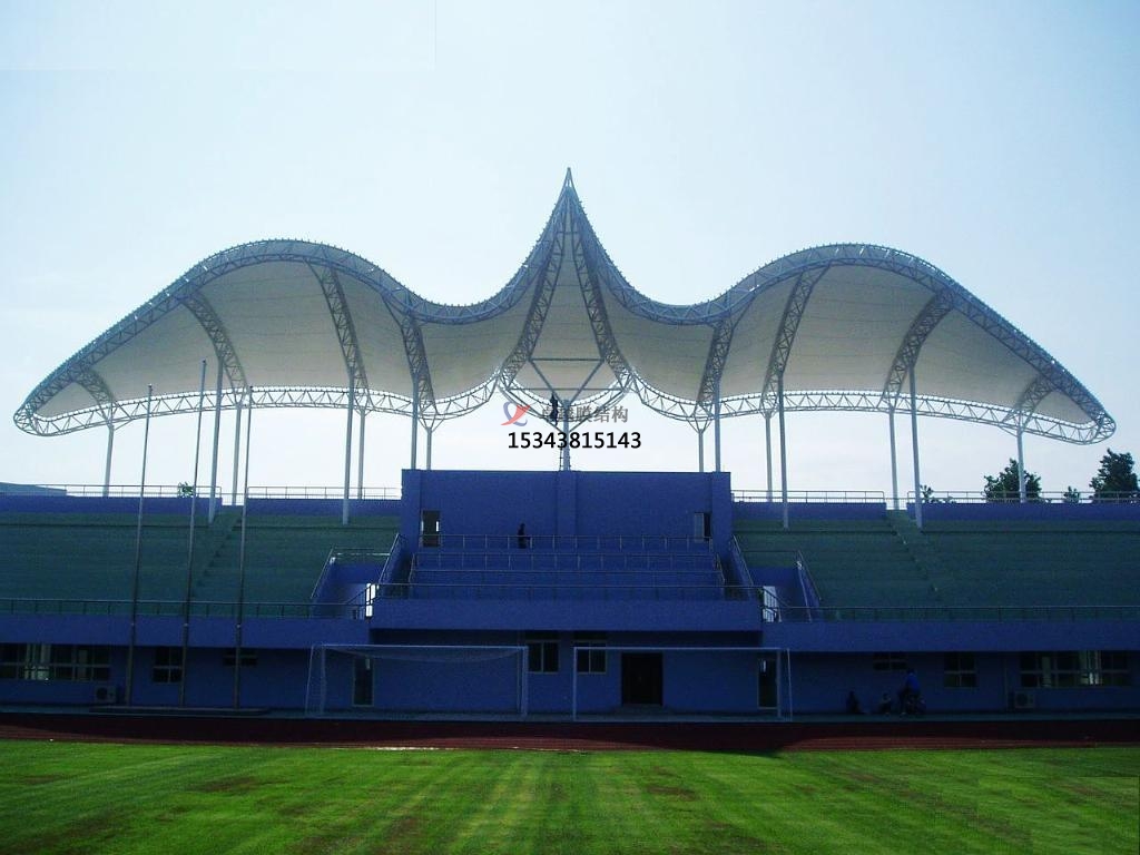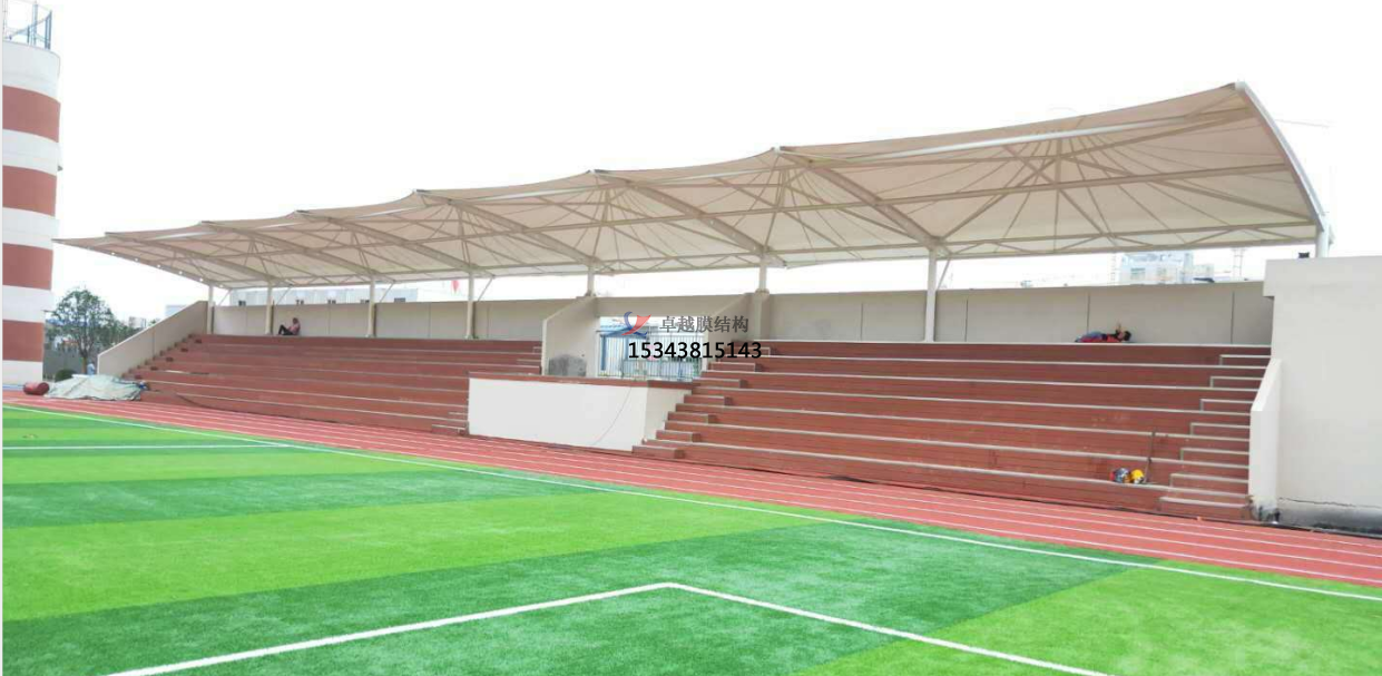 膜結(jié)構(gòu)看臺(tái)在體育設(shè)施上主要應(yīng)用在學(xué)校操場(chǎng)運(yùn)動(dòng)看臺(tái)或主席臺(tái)屋頂,另外大型體育場(chǎng)館看臺(tái)膜結(jié)構(gòu)屋頂也屢見(jiàn)不鮮??磁_(tái)造型般由貝殼形峰膜及部張拉膜組成,形式新穎活潑。膜結(jié)構(gòu)看臺(tái)將鋼架、索、膜巧妙結(jié)合,通過(guò)薄膜、膜邊索、脊索、谷索、拉索、拉桿及定的格構(gòu)梁來(lái)穩(wěn)定。膜頂平滑過(guò)渡,結(jié)構(gòu)美觀、輕巧、整體造型相互輝映,別具格。