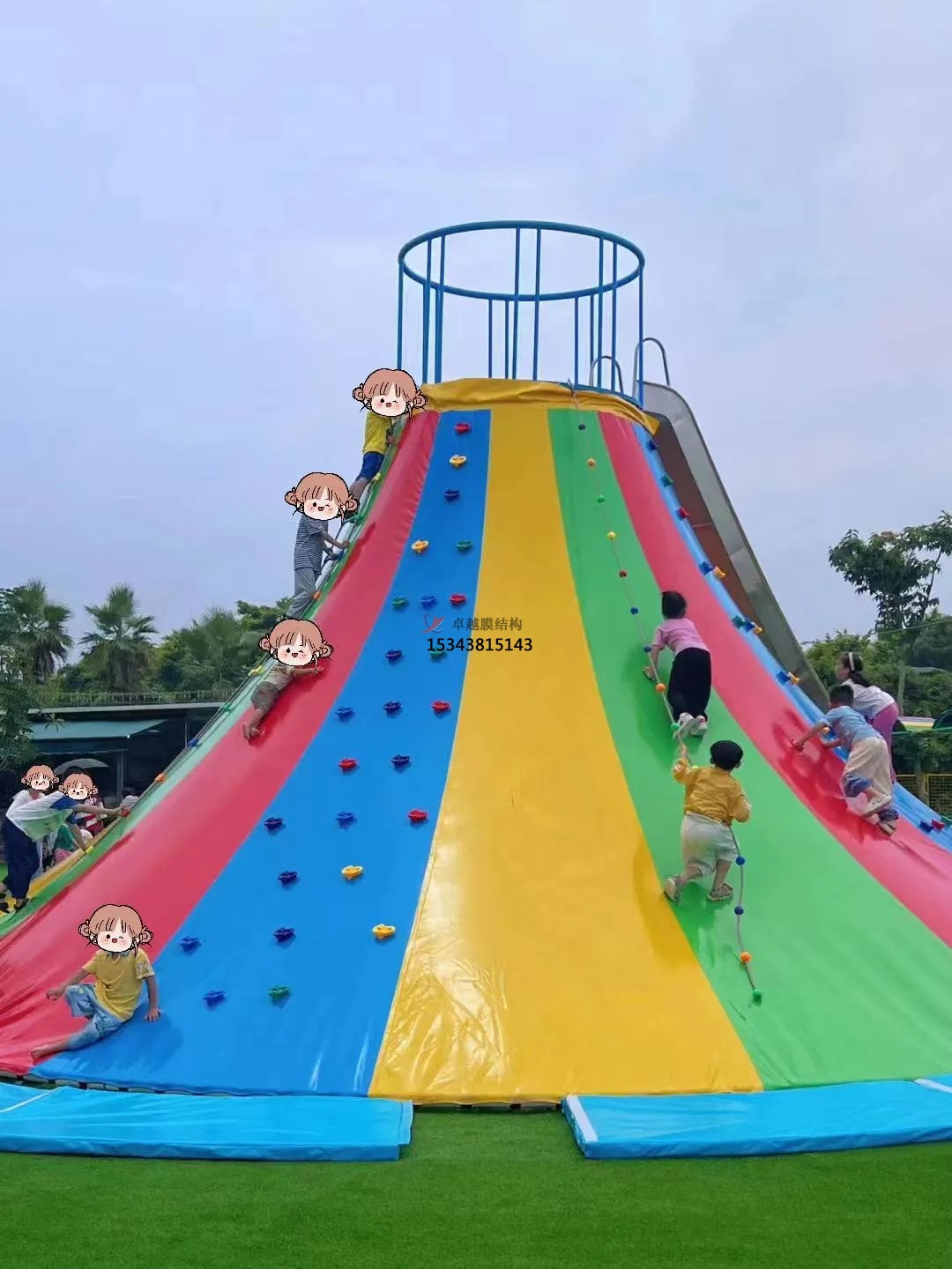 小朋友們可以從底部貼緊“火山”,雙手抓住巖石向上攀登,當(dāng)成功攀巖到山頂時(shí),可以從“火山”頂部通過(guò)滑梯或者“火山”表面滑下來(lái)。