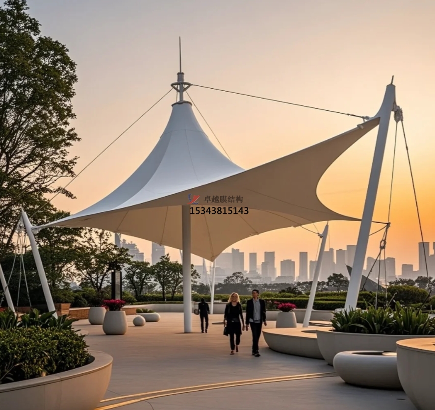 輕質(zhì)高強,穩(wěn)固耐用:景觀膜結(jié)構(gòu)采用的高強度薄膜材料,重量僅約為傳統(tǒng)建筑結(jié)構(gòu)材料的十分之一,極大地減輕了自身重量。但 “輕量級” 的它卻有著超乎想象的強大實力,拉伸強度極高,在面對風(fēng)荷載與雪荷載時,能憑借出色的韌性與剛性,展現(xiàn)卓越的穩(wěn)定性。在強風(fēng)天氣中,膜結(jié)構(gòu)可通過自身的柔性變形來緩沖風(fēng)力,避免因剛性抵抗而導(dǎo)致結(jié)構(gòu)損壞;面對積雪,其合理的造型與支撐設(shè)計能使積雪均勻分布或自然滑落,防止因積雪過重造成坍塌,為景觀設(shè)施提供可靠的安全保障。