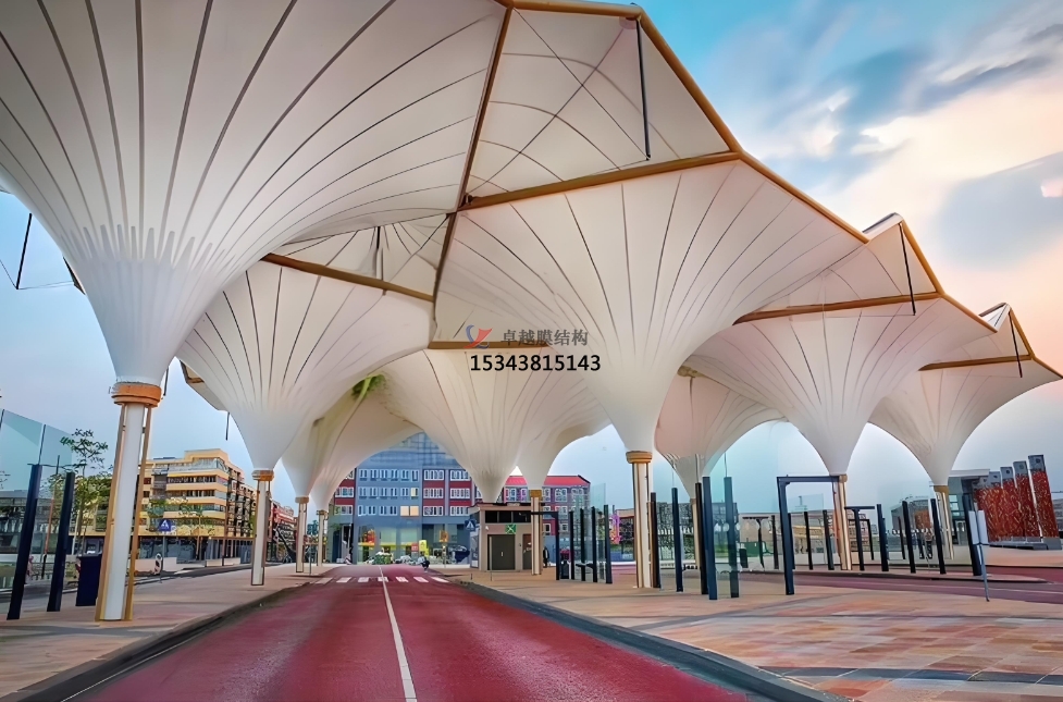 此外,PTFE膜結(jié)構(gòu)的薄膜具有一定的透光性,能夠有效利用自然光線,降低室內(nèi)照明能耗,能夠遮擋紫外線和紅外線,減少太陽輻射對建筑內(nèi)部的熱負(fù)荷,實現(xiàn)能源的節(jié)約和環(huán)境的保護(hù);而且PTFE膜結(jié)構(gòu)能夠通過不同的張拉和固定方式,創(chuàng)造出各種形態(tài)的建筑設(shè)計。它可以形成曲線、弧線、折線等多樣化的形狀,滿足建筑師對于獨特外觀和創(chuàng)新設(shè)計的需求。
