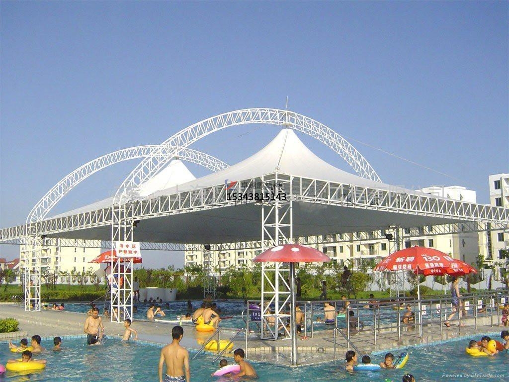 6、景觀設(shè)施:膜結(jié)構(gòu)以其特殊的建筑表現(xiàn)手法,主要體現(xiàn)在造型、漫射透光性、豐富多彩,可廣泛應(yīng)用于入口、標志性小品 、步行街、停車場等,其他建筑特性無須較高要求。