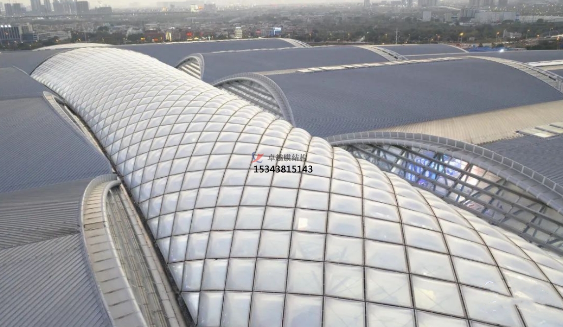 高鐵站膜結(jié)構(gòu)是一種新型的建筑結(jié)構(gòu)形式,它采用高強度柔性薄膜材料與支撐體系相結(jié)合,通過一定的技術(shù)手段,使其內(nèi)部產(chǎn)生一定的預(yù)張力,從而形成具有一定剛度和穩(wěn)定性的空間結(jié)構(gòu)體系。這種結(jié)構(gòu)形式具有重量輕、跨度大、造型美觀、施工速度快等優(yōu)點,能夠滿足高鐵站大空間、大跨度的建筑需求。