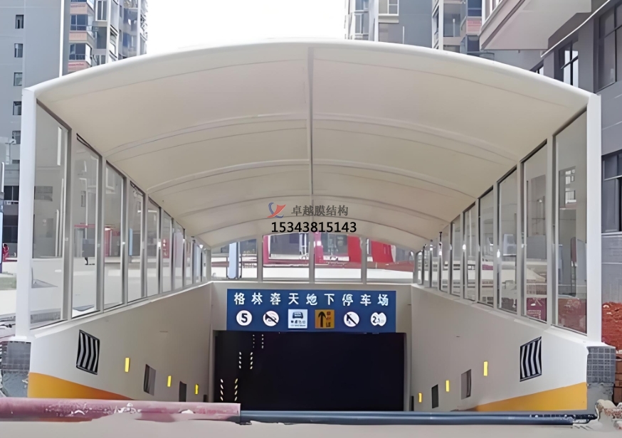 在一些大型商業(yè)綜合體中,膜結(jié)構(gòu)頂棚被廣泛應(yīng)用于車庫(kù)出入口。例如,上海某商業(yè)綜合體的車庫(kù)出入口采用了張拉式膜結(jié)構(gòu)頂棚,其獨(dú)特的造型和良好的性能不僅為車輛和行人提供了便利,還成為了該商業(yè)綜合體的一大亮點(diǎn)。