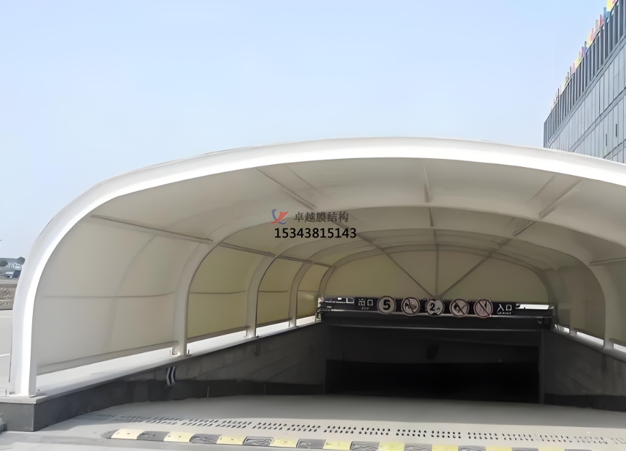 膜結(jié)構(gòu)頂棚采用高強(qiáng)度膜材,能夠有效抵御紫外線、雨水和風(fēng)雪的侵襲。對(duì)于車庫(kù)出入口來(lái)說(shuō),它可以避免車輛因長(zhǎng)時(shí)間暴露在惡劣天氣中而受到損害,同時(shí)也能為行人提供一個(gè)安全、舒適的通行環(huán)境。