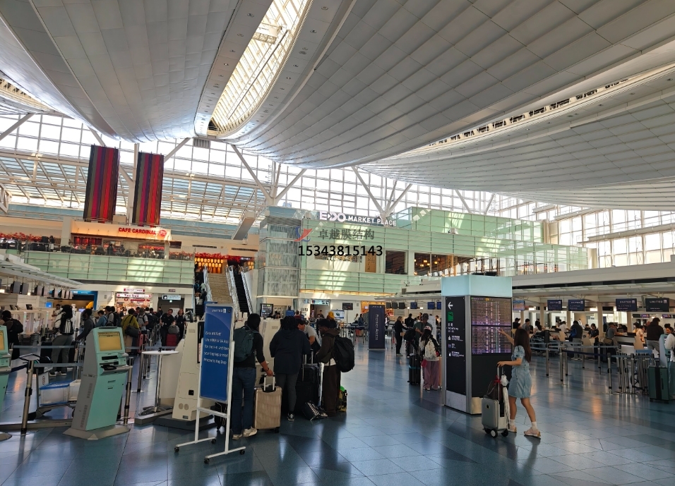 國外眾多大型機(jī)場(chǎng)也早已將膜結(jié)構(gòu)廣泛運(yùn)用于修建規(guī)劃中。比方美國丹佛新國際機(jī)場(chǎng)候機(jī)大廳,其采用的索膜結(jié)構(gòu)系統(tǒng)令人矚目。索膜結(jié)構(gòu)系統(tǒng)起源于遠(yuǎn)古時(shí)代人類居住的帳子,在 20 世紀(jì) 70 時(shí)代以后,跟著高強(qiáng)、防水、透光且外表光潔、易清洗、抗老化的修建膜資料的出現(xiàn),以及工程核算科學(xué)的飛速發(fā)展,這一結(jié)構(gòu)系統(tǒng)得以復(fù)興,并大量運(yùn)用于大空間的公共修建,機(jī)場(chǎng)便是其間重要的運(yùn)用領(lǐng)域。丹佛新國際機(jī)場(chǎng)候機(jī)大廳的索膜結(jié)構(gòu),造型自在、輕巧、柔美,充滿力量感,為旅客營建出共同的空間體會(huì)。其不只在外觀上極具視覺沖擊力,在功用上也體現(xiàn)杰出。膜結(jié)構(gòu)能有用克服傳統(tǒng)結(jié)構(gòu)在大跨度修建上的困難,創(chuàng)造出巨大的無遮擋可視空間,滿意了機(jī)場(chǎng)關(guān)于開闊空間的需求,使旅客在候機(jī)過程中視野愈加開闊,削減壓抑感。
