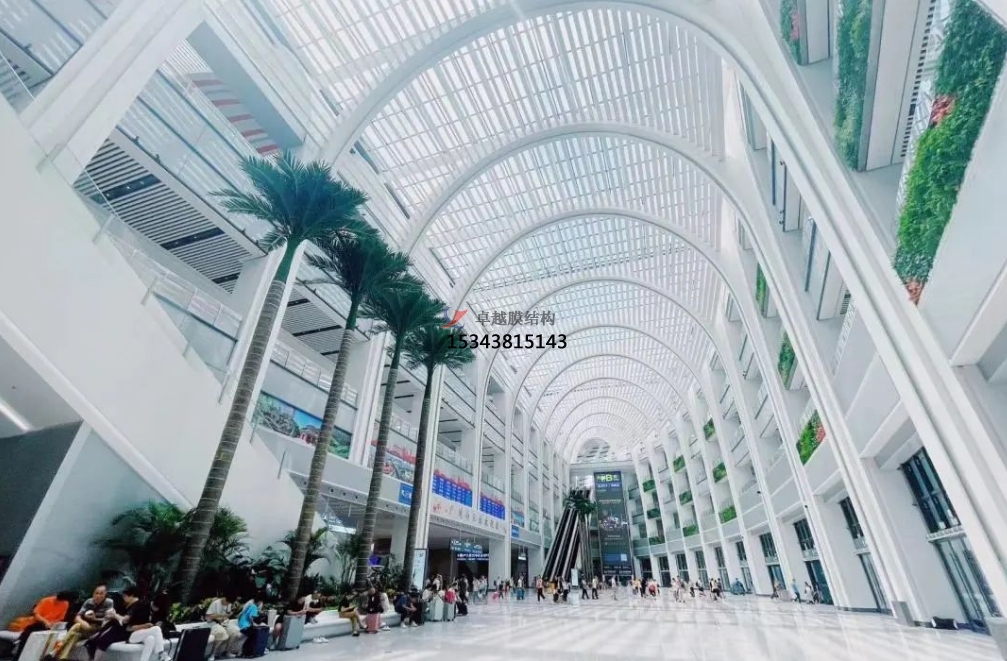 安全耐用‌:膜材料抗腐蝕能力強(qiáng),化學(xué)性能穩(wěn)定,使用壽命可長(zhǎng)達(dá)15-25年。且膜結(jié)構(gòu)能夠承受一定外荷載,確保高鐵站的安全運(yùn)行。