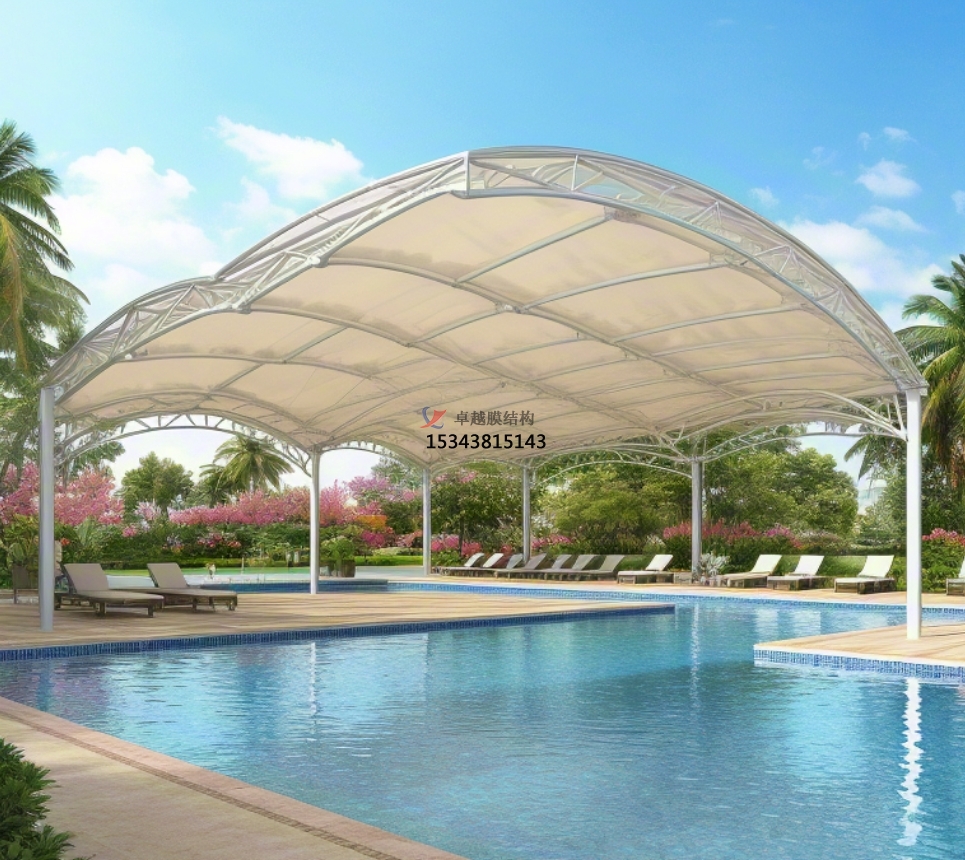 游泳池膜結(jié)構(gòu)遮陽(yáng)棚的款式多樣,包括單坡、雙坡、穹頂、懸臂等多種款式。不同款式的遮陽(yáng)棚在造型、結(jié)構(gòu)、用途等方面都有所不同,例如單坡款式的遮陽(yáng)棚一般用于遮陽(yáng),雙坡款式的遮陽(yáng)棚則可用于遮陽(yáng)和擋雨,穹頂款式的遮陽(yáng)棚則具有較好的觀賞性,懸臂款式的遮陽(yáng)棚則可提供較大的開放空間。這些多樣化的選擇,使得泳池遮陽(yáng)棚能夠滿足不同場(chǎng)地和需求,實(shí)現(xiàn)個(gè)性化定制。