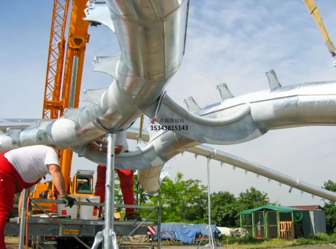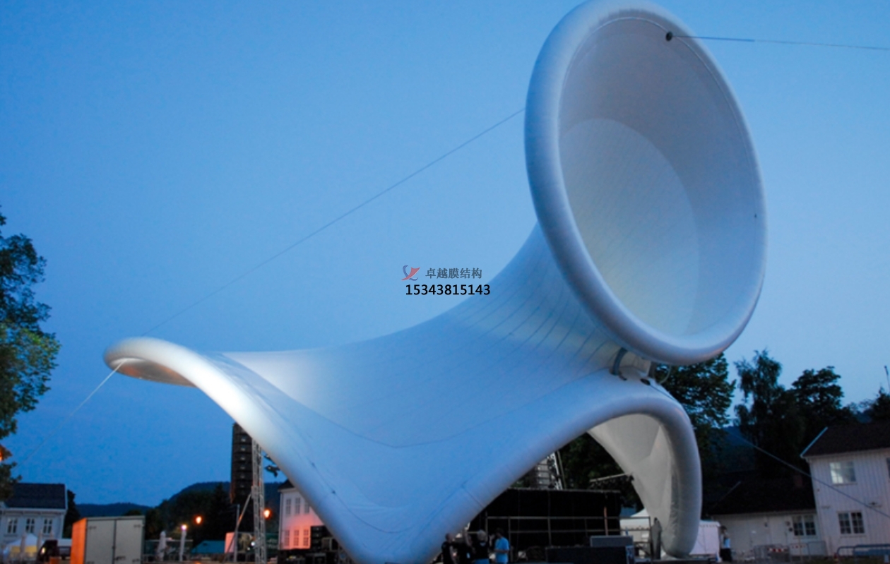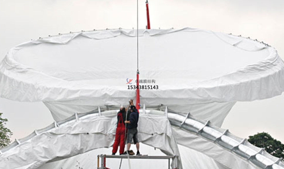 充氣膜張拉膜方便在節(jié)日期間快速豎立并吊裝到位。管狀骨架可以與織物覆蓋物一起拆卸和裝箱。