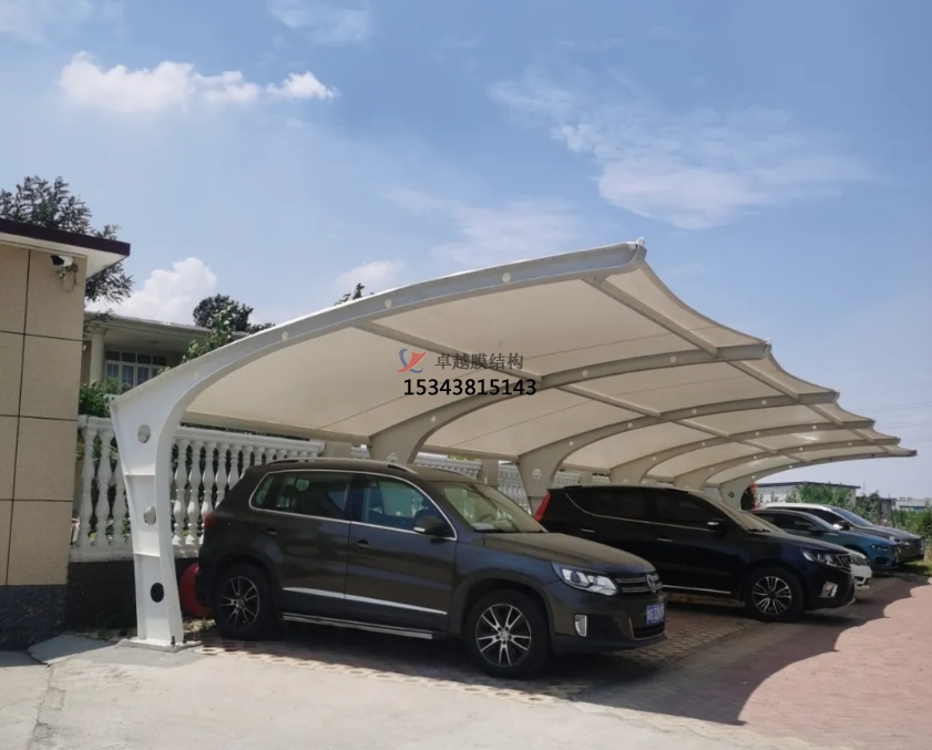 膜結(jié)構(gòu)材料具有良好的可塑性,能夠呈現(xiàn)出流暢的曲線和獨(dú)特的造型。對于7字型車棚而言,膜材可以根據(jù)設(shè)計(jì)要求形成優(yōu)美的坡面和線條,與周邊的建筑和環(huán)境相融合。它可以是簡潔現(xiàn)代的風(fēng)格,展現(xiàn)出科技感和時(shí)尚感;也可以是富有藝術(shù)氣息的設(shè)計(jì),成為整個(gè)區(qū)域的視覺焦點(diǎn),為原本單調(diào)的停車區(qū)域增添一份美感。