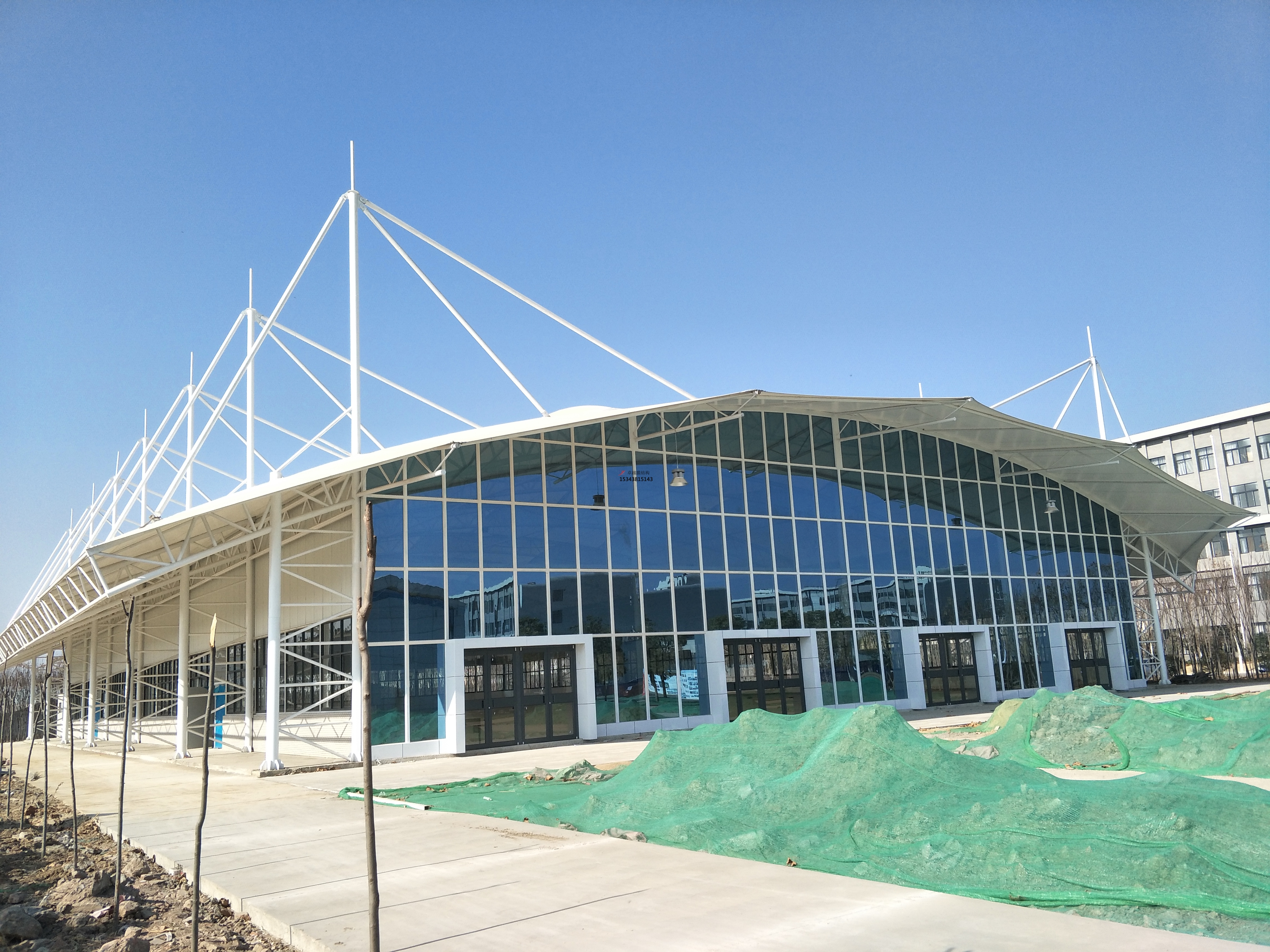 膜結(jié)構(gòu)籃球場雨棚優(yōu)勢:其優(yōu)勢可分為性能優(yōu)勢、功能優(yōu)勢、施工與經(jīng)濟優(yōu)勢、美觀優(yōu)勢四大類。性能優(yōu)勢表現(xiàn)在其輕質(zhì)高強,膜結(jié)構(gòu)雨棚采用的膜材料重量輕,但強度高,如高強度聚酯纖維織物與 PVC 涂層的組合,在保證雨棚安全性的同時,還能實現(xiàn)大跨度、無柱設(shè)計,為籃球場提供寬敞、無遮擋的運動空間??购蛐詮姡咝阅艿?PVC 或 PTFE 等膜材料,具有極強的抗紫外線、耐腐蝕、抗老化等特性,能在惡劣天氣條件下保持良好性能,延長雨棚使用壽命。自潔性好,許多膜材表面有防污涂層,在自然風(fēng)力和雨水沖刷下可保持自潔,減少清洗和維護頻率,同時保證膜材的美觀和透光性;功能優(yōu)勢表現(xiàn)在其遮陽擋雨,能有效遮擋陽光和雨水,為球員和觀眾提供舒適的環(huán)境,使籃球場在各種天氣條件下都能正常使用,提高場地利用率。通風(fēng)透光,具有良好的透光性和透氣性,可自然采光,減少電能消耗,同時保證場館內(nèi)空氣流通,為運動員和觀眾創(chuàng)造舒適的環(huán)境;施工與經(jīng)濟優(yōu)勢表現(xiàn)在施工簡便,膜結(jié)構(gòu)雨棚的施工周期短,膜材在加工廠統(tǒng)一加工后運輸?shù)浆F(xiàn)場安裝,且主體鋼結(jié)構(gòu)基本材料也可在工廠完工,直接拉到現(xiàn)場安裝,節(jié)省現(xiàn)場施工時間。成本較低,相比傳統(tǒng)的混凝土結(jié)構(gòu)風(fēng)雨球館,膜結(jié)構(gòu)雨棚的造價更低,且維護成本也低,長期來看具有較高的性價比;美觀優(yōu)勢表現(xiàn)在其造型多樣,膜結(jié)構(gòu)雨棚采用獨特的曲面設(shè)計,線條流暢,可以根據(jù)客戶需求定制不同的顏色、圖案和形狀,如弧形、穹頂形、錐形等,使籃球場更具個性,提升球場檔次。融合性好,能夠與周圍環(huán)境和諧融合,無論是在學(xué)校、公園、小區(qū)還是商業(yè)場所,都能成為建筑的一個亮點。