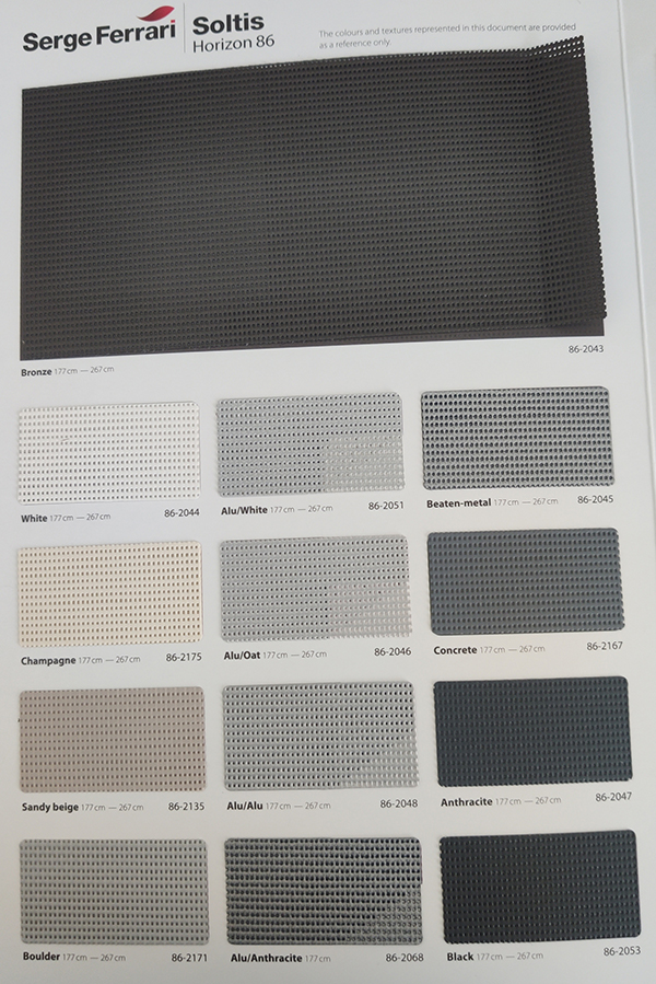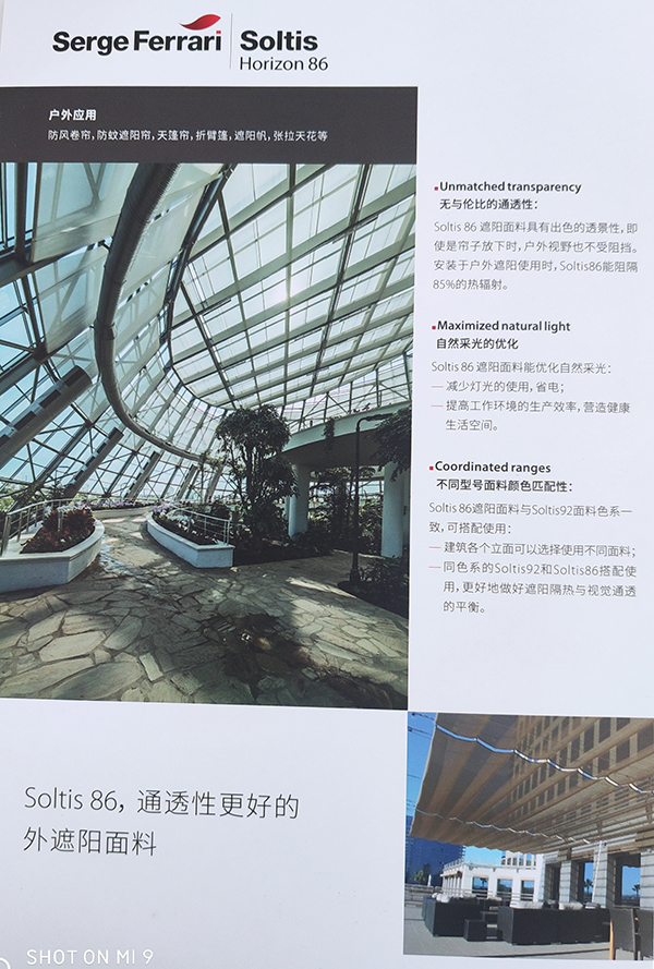 紗帝飾:紗帝飾面料為抵擋熱量和光線的真正盾牌,依靠其微型通風結(jié)構(gòu),調(diào)節(jié)陽光的熱效應,有效地防眩目。紗帝飾面料具有46種顏色,可為所有建筑,無論是 公眾場合還是私人住宅提供配套的眾多色彩和多種用途。法拉利預應力專利制造技術(shù)給紗帝飾織物帶來尺寸恒定,不會變形,無需加固自然抗撕拉,耐久和抗塵,占 地面積小等獨有特性,更顯出紗帝飾面料對建筑物技術(shù)性遮陽無可匹敵的優(yōu)勢。